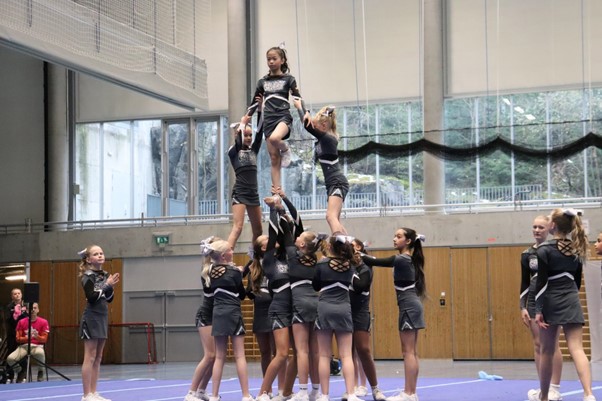 Hallen åpnet for publikum og billettsalg klokken 09.00 og tribunen fylte seg raskt opp. Vi hadde også besøk av Cheermania og Happy Cheerbows som stilte med ulike klubbeffekter, cheersko, sløyfer og div. Noe som var svært populært, både for store og små utøvere samt foreldre og besøkende. I år var det spesielt et strutteskjørt fra cheermania som ble trendy. Her ser dere noen av våre junior utøvere som gladelig poserte til våre fotografer som tok ellers bilder av alle lag på matten.