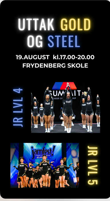 Uttaksskjemaer for Thunder, Steel, Gold og senior Publisert av Hanne Holm-Lunder Markussen den 08.08.25. Uttaks datoer: Oppmøte 30 min før uttaket starterSteel lv 4 og Gold lv 5 (junior): 19.august kl17:00 - 20:00Thunder youth lv 4: 20. august kl17:00 - 20:00Senior lv 6: 21.august kl17:00 - 20:00Uttaksskjema senior sesong 25/26Uttaksskjema Steel og Gold sesong 25/26Uttaksskjema Thunder sesongen 25/26